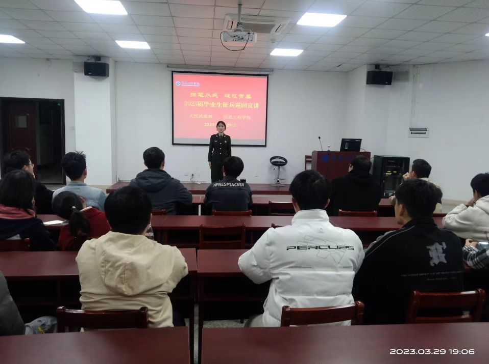 开展征兵巡回宣讲6场,人武部征兵工作人员解读了兵役政策法规,理学院李娜、水利与生态工程学院王僖玙等优秀退役复学学生结合自身军旅经历讲解了参军入伍十大获益。