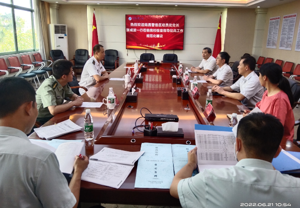 6月21日,南昌市征兵办副主任、南昌警备区动员处处长张成波一行来校检查指导征兵工作规范化建设,校党委书记金志农与检查指导组在行政楼300会议室座谈交流。校党委委员、党委统战部部长欧阳子龙,青山湖区武装部、校人民武装部相关人员参加会议。