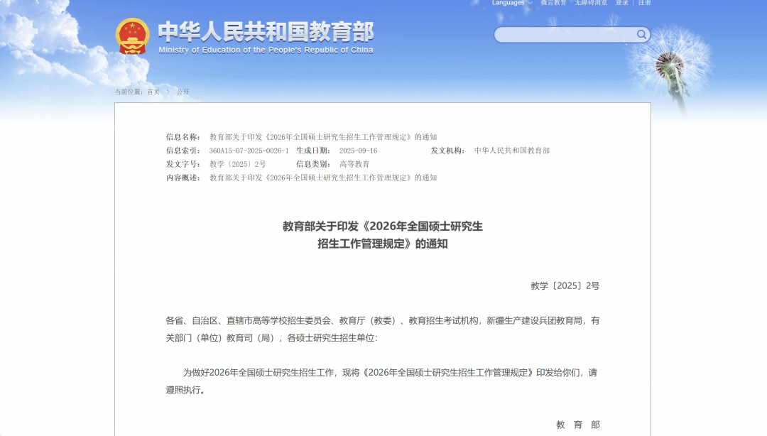 近日,教育部印发《2026年全国硕士研究生招生工作管理规定》的通知。